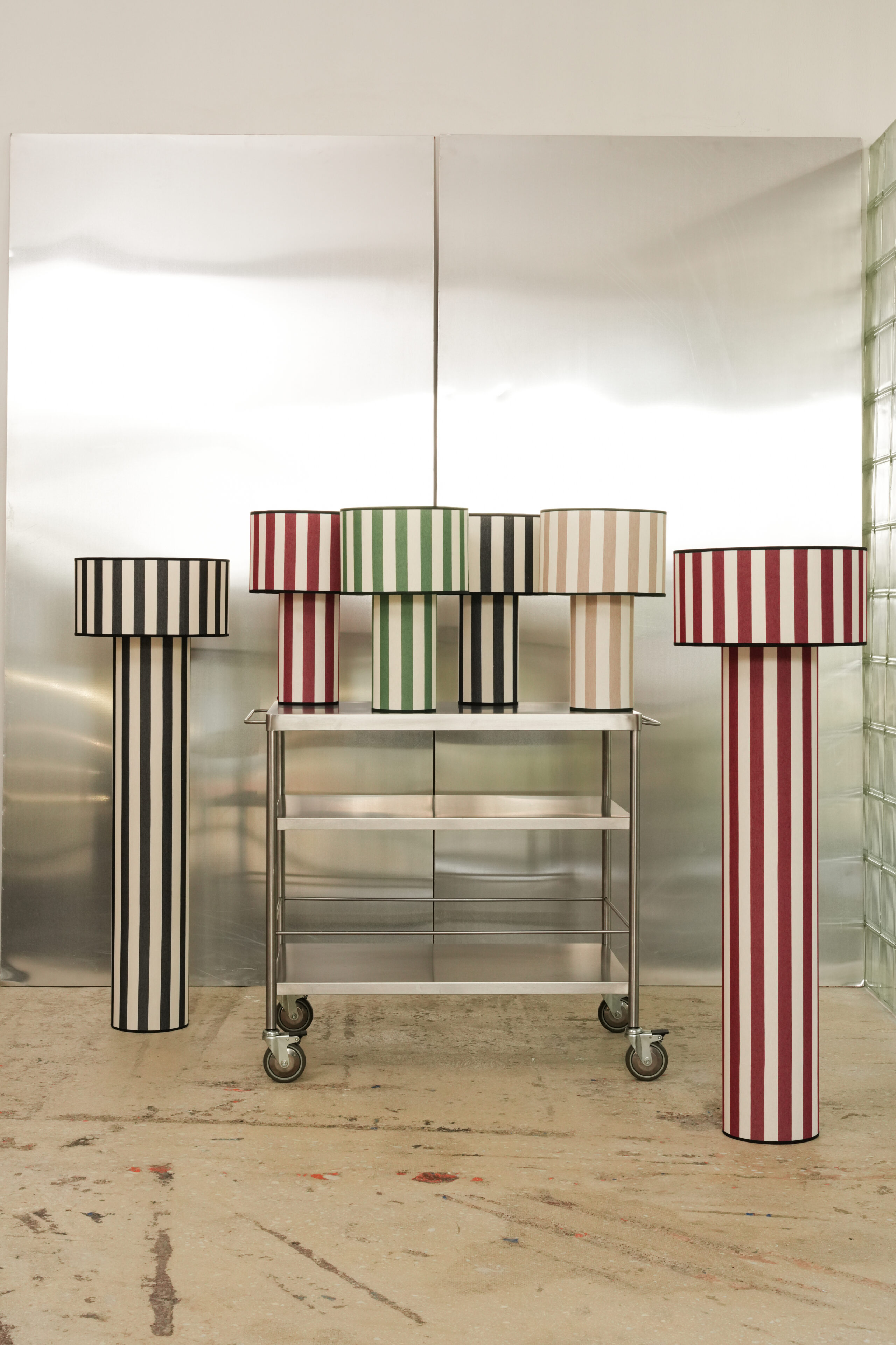 Η υφή του βαμβακερού υφάσματος αναδεικνύει καθαρά το μοτίβο των ριγών, δημιουργώντας ένα φωτιστικό που λειτουργεί τόσο ως πηγή φωτός όσο και ως διακριτικό statement piece στον χώρο.