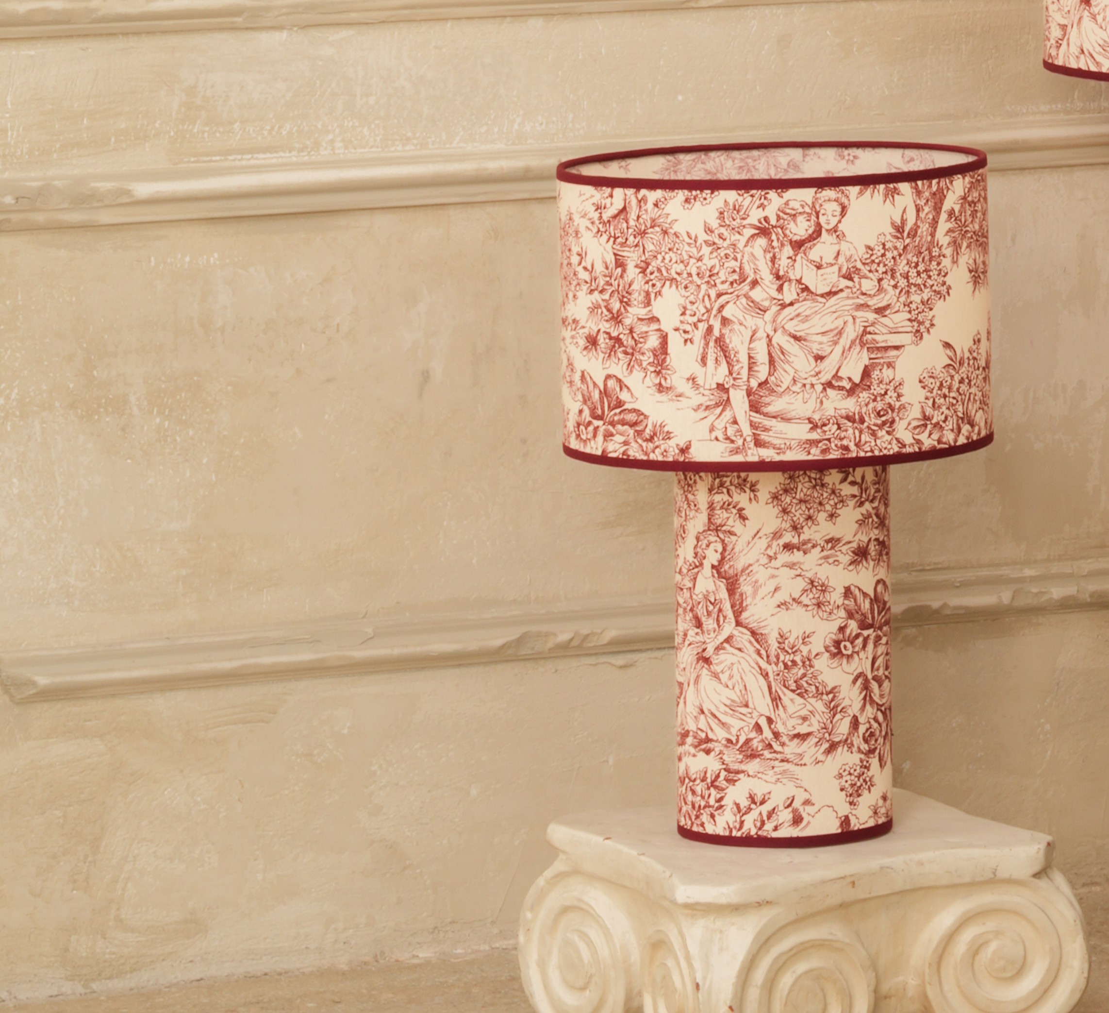 Δημιουργείται εξ ολοκλήρου στο χέρι, στο ατελιέ μας, στην καρδιά της Αθήνας. Η βάση και το καπέλο κατασκευάζονται από το ίδιο υλικό και επενδύονται με βαμβακερό ύφασμα υψηλής ποιότητας. Το ύφασμα σε μπεζ απόχρωση με βουργουνδί μοτίβα είναι εμπνευσμένο από τις  φιγούρες και τη συμμετρία των κήπων των Βερσαλλιών, αποπνέοντας διαχρονική κομψότητα και ρομαντισμό. Ο συνδυασμός των ήπιων μπεζ τόνων με τα βαθιά βουργουνδί διακοσμητικά στοιχεία δημιουργεί μια αίσθηση αρχοντικής αισθητικής, μετατρέποντας το φωτιστικό σε ένα ιδιαίτερο διακοσμητικό αντικείμενο με έντονη προσωπικότητα.
