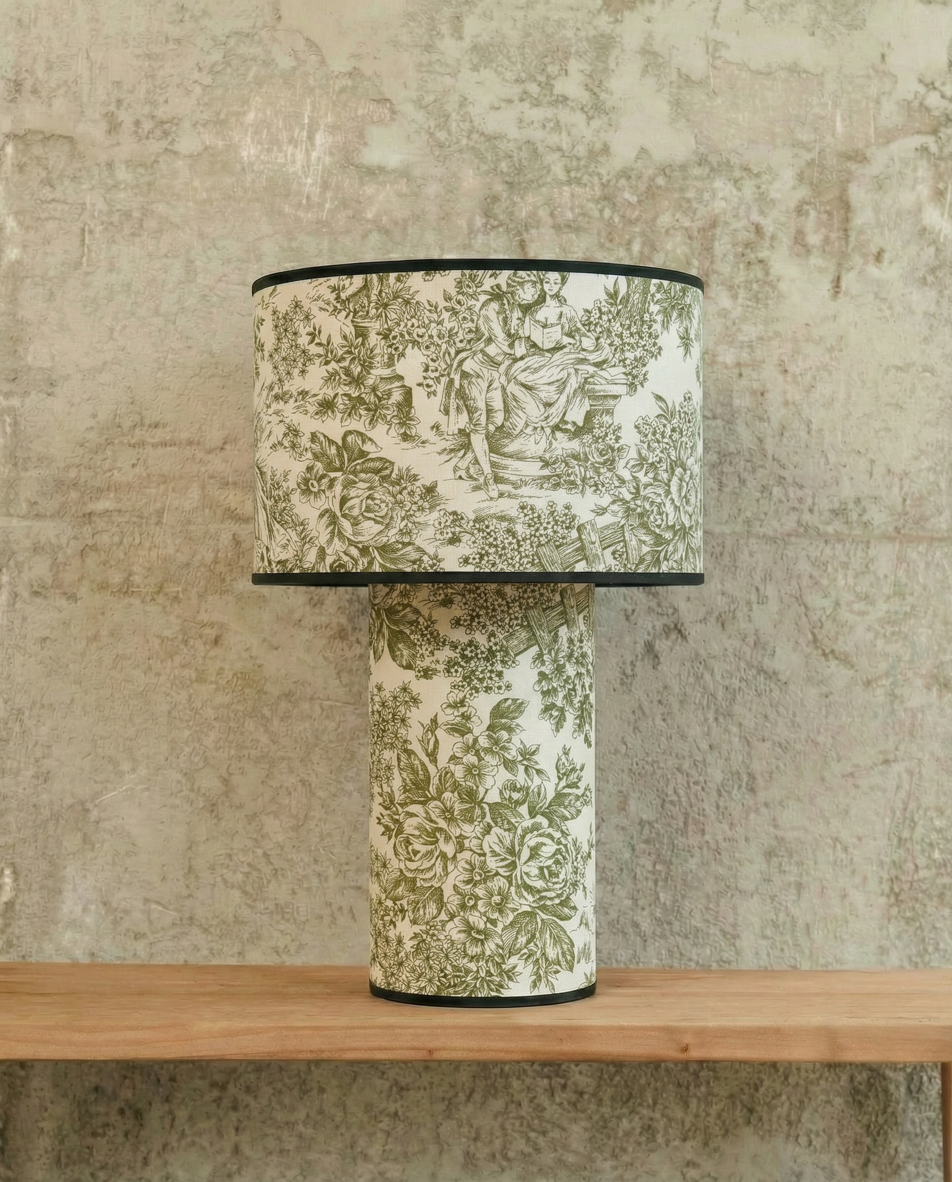 Ένα κομψό επιτραπέζιο φωτιστικό με έντονο ρομαντικό και vintage χαρακτήρα. Το καπέλο και η βάση επενδύονται με το ίδιο υφασμάτινο μοτίβο σε εκρού και λαδί αποχρώσεις, δημιουργώντας μια αρμονική και ολοκληρωμένη αισθητική πρόταση. Το σχέδιο εμπνευσμένο από κλασικά toile μοτίβα, με λουλούδια και σκηνές εποχής, προσδίδει διαχρονική φινέτσα και ιδιαίτερη γοητεία.