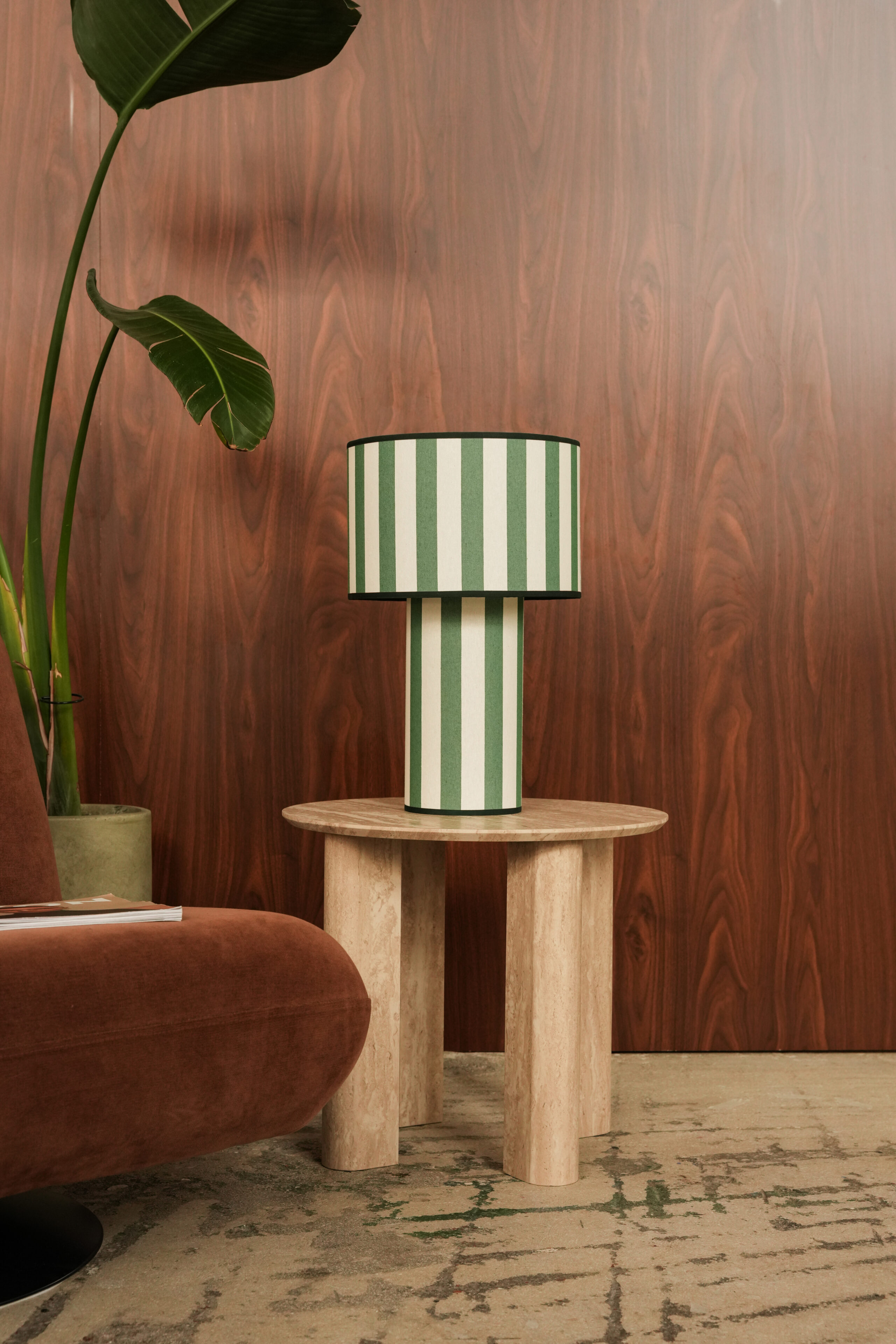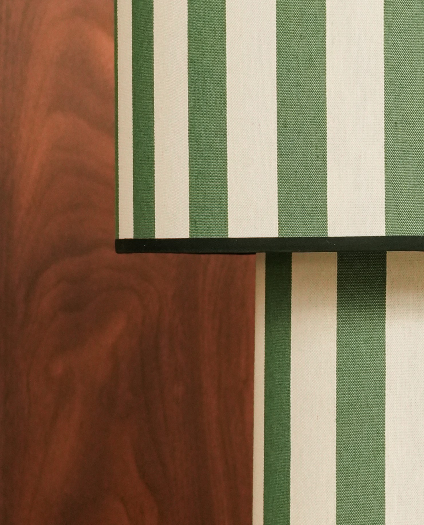 Δημιουργείται εξ ολοκλήρου στο χέρι, στο ατελιέ μας, στην καρδιά της Αθήνας. Η βάση και το καπέλο κατασκευάζονται από το ίδιο υλικό και επενδύονται με βαμβακερό ύφασμα υψηλής ποιότητας με πράσινες ρίγες. Το ριγέ μοτίβο, διαχρονικό και κομψό, προσδίδει στο φωτιστικό μια αίσθηση φρεσκάδας και ισορροπίας, ενώ οι πράσινες αποχρώσεις παραπέμπουν στη φυσική ηρεμία και τη ζωντάνια της φύσης. Το σχέδιο δημιουργεί μια διακριτική αλλά ιδιαίτερη παρουσία στον χώρο, μετατρέποντας το φωτιστικό σε ένα εκλεπτυσμένο διακοσμητικό στοιχείο.