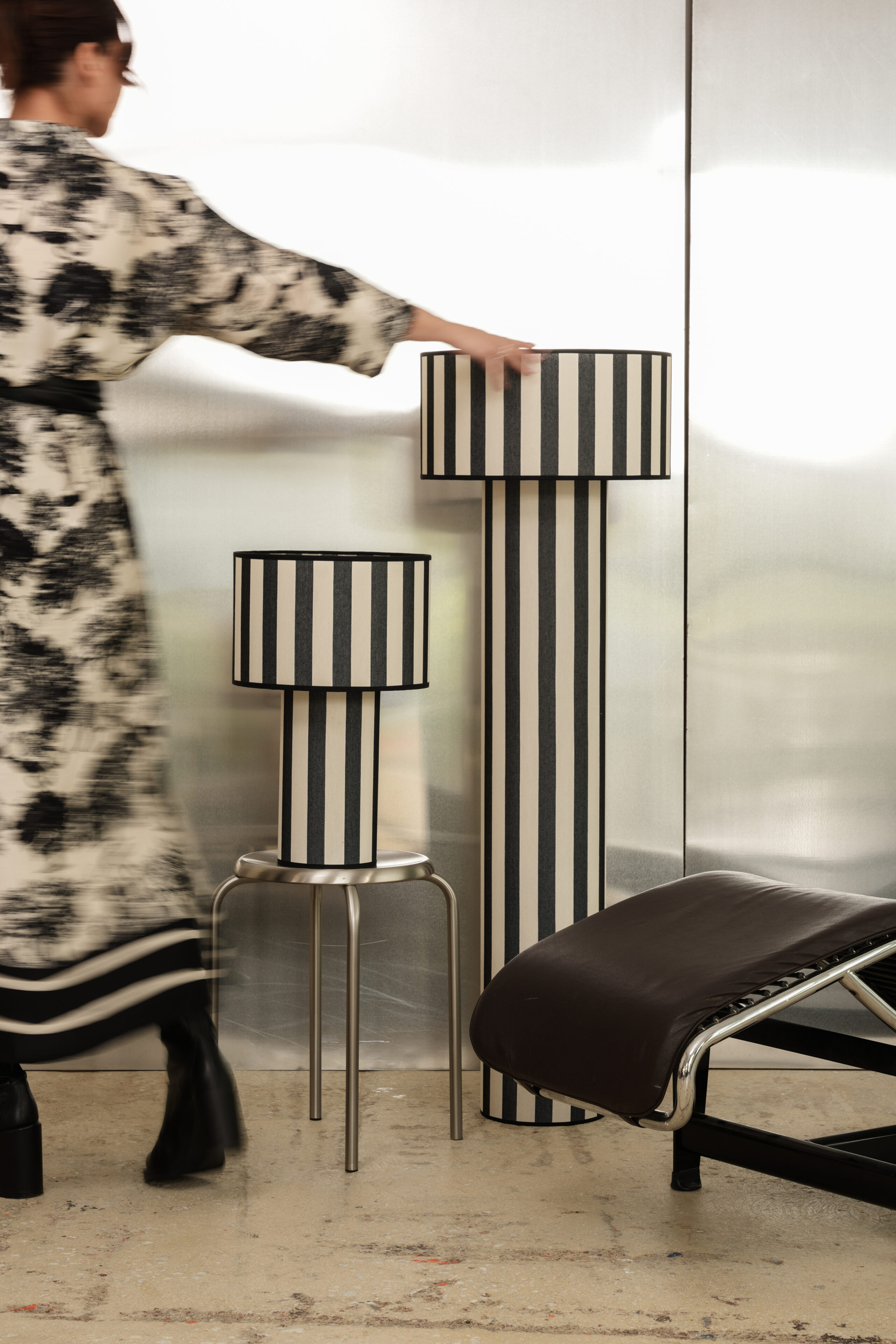 Η υφή του βαμβακερού υφάσματος αναδεικνύει καθαρά το μοτίβο των ριγών, δημιουργώντας ένα φωτιστικό που λειτουργεί τόσο ως πηγή φωτός όσο και ως διακριτικό statement piece στον χώρο.